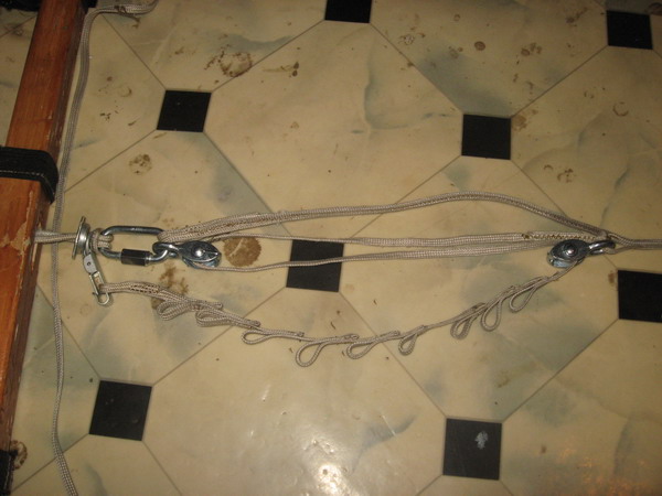 1.железки под куполом убрать.у тебя на полиспасте петли вполне можно их использовать если на силовых узлы навязать ну или добавить поводочки сложеную вдвое веревочку завязаную узлом 5-10см .петлю в петлю а на узел петлю от строп -удлиннителей.