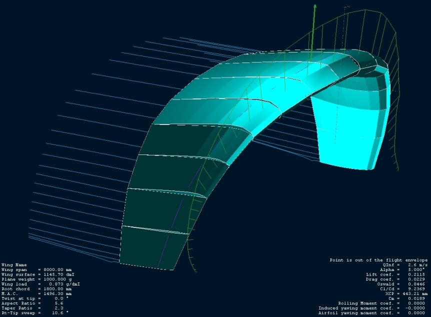На B13 похоже стоит reflexed профиль. Для интереса продул его и приблизительно похожий кайт в XFLR. Картинки ниже. К сожалению, видно, что тяга на этом профиле таки да создается на площади, даже меньшей, чем 1/3 хорды. Так что, чтобы добиться нормального депауэра, надо очень сильно сдвигать tow-point вперед. Хотя форма в плане немного спасает положение...
