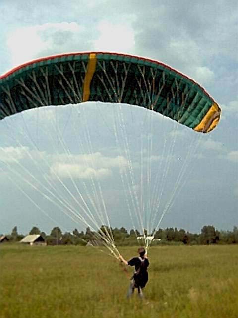 Хотя, как ни странно..., все получилось довольно крепким и надежным. Что только не вытворяли с этим куполом - ни одного порыва на нем до сих пор нет. Потом немного изменил (перешил) носовую часть купола. После этого на нем больше не летали, поскольку купили вскладчину нормальный фирменный параплан. Сейчас лежит мое творение в гараже. Перед тем как сшить параплан из ткани я наверное штук 50 сделал моделек из бумаги - проверял как они летают. Инфы никакой на тот момент вообще об этом не было. Приходилось абсолютно все самомму догонять и проверять, руководствуясь папиными лишь книгами по аэродинамике и динамике полета самолета с ТРД.