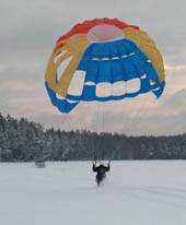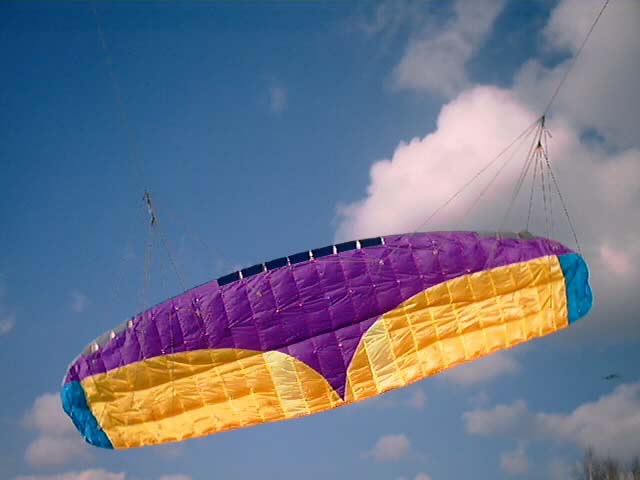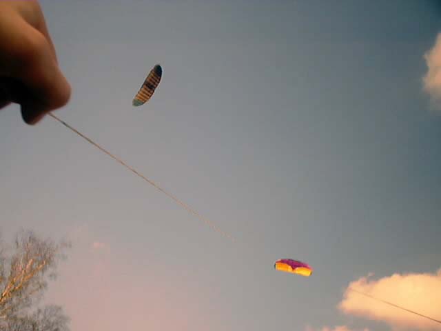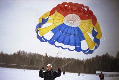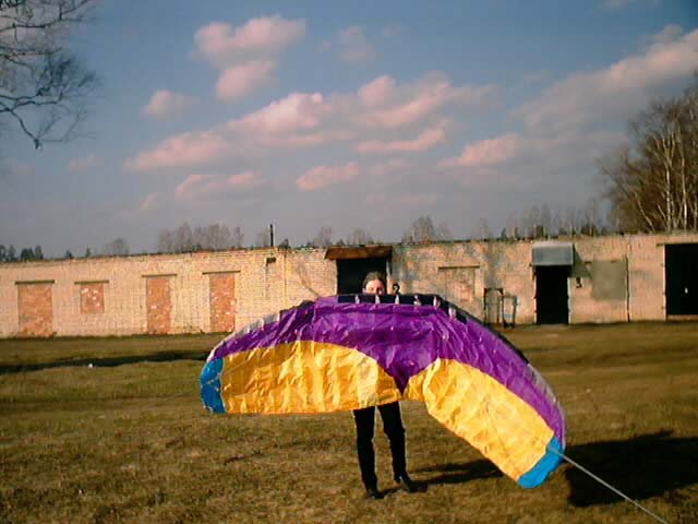 Черный Полдник - по-моему 2 квадрата площадью. Тоже нормально летал. Продался где-то возле Анапы за 50$ подсевшему на кайтинг отдыхающему. Причем, он перед женой оправдывался, что якобы для сына его берет, хотя сыну, по-ходу, кайты были параллельны...