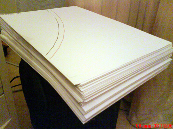 В принципе можно печатать на плоттере, меньше листов. А вообще лучше не клеить (первую выкройку я именно клеил, ну и морока). Теперь скрепляю широким скотчем. Предварительно обрезаю уголки для состыковки. Состыковываю полосочками бумажного скотча и все скрепляю широким скотчем с двух сторон. Для "безумной лошади сто миль не крюк", так и для самодельщика 500 листов тоже... Very Happy